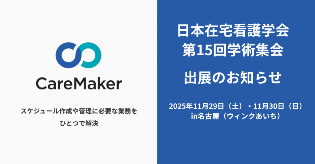 訪問看護・訪問介護向けにスケジュール管理クラウド「CareMaker(ケアメーカー)」を運営する株式会社CareMaker(愛知県豊橋市、代表取締役:山村真稔、以下「CareMaker」)は、2025年11月29日(土)・30日(日)に愛知県名古屋市にあるウィンクあいちで開催される「日本在宅看護学会第15回学術集会」(主催:日本在宅看護学会)に出展いたします。